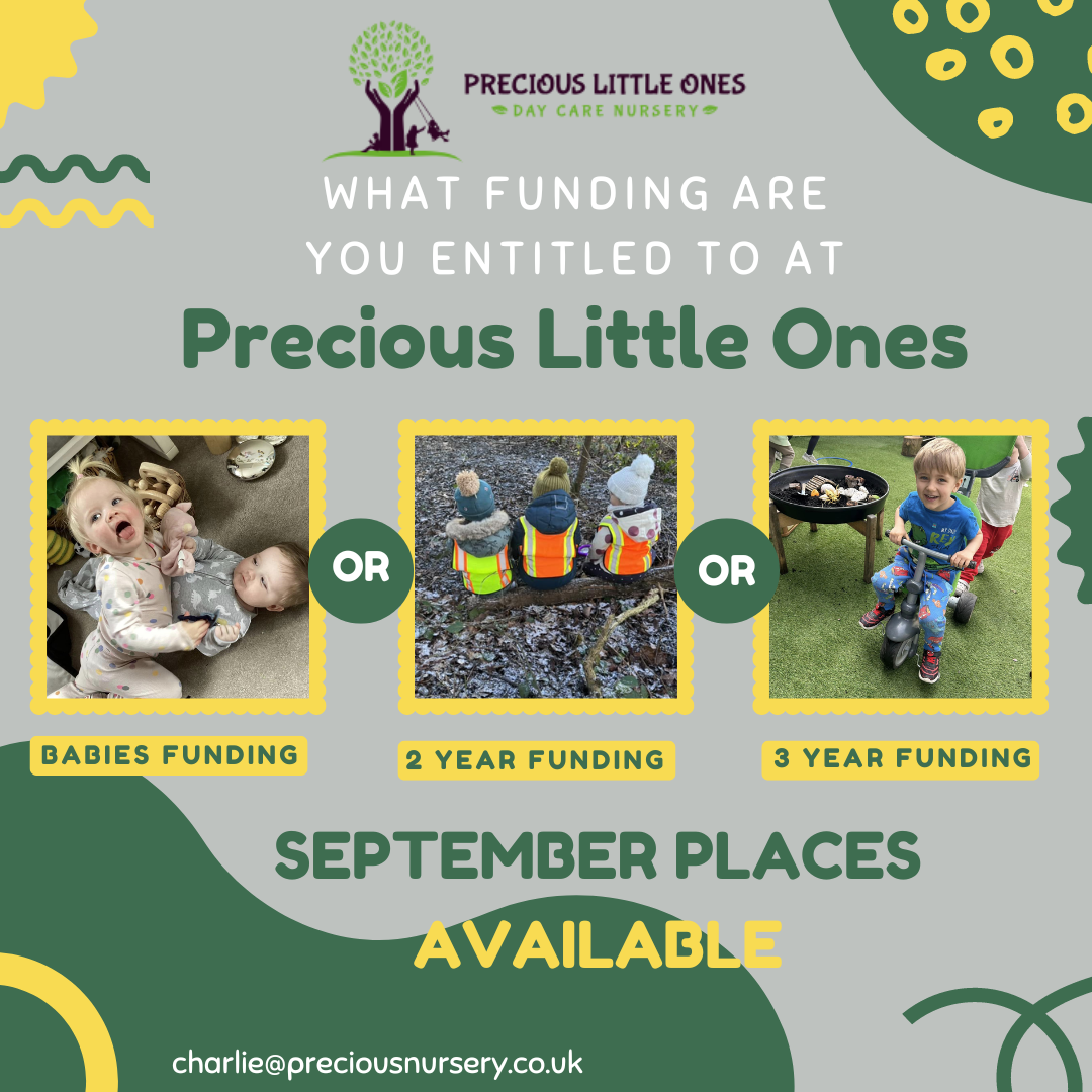 15 hours free funded hours for 9 months – 2 year olds. 15 hours free funded hours for 2 year olds. 15/30 hours free funded hours for 3-5 year olds.